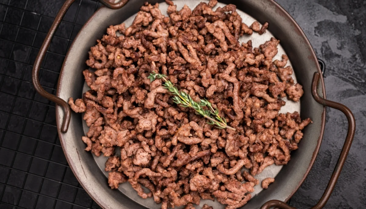 Savourez un bĆuf hachĂ© poĂȘlĂ© croustillant et parfumĂ© aux herbes, idĂ©al pour accompagner des lĂ©gumes, des pĂątes ou du riz.