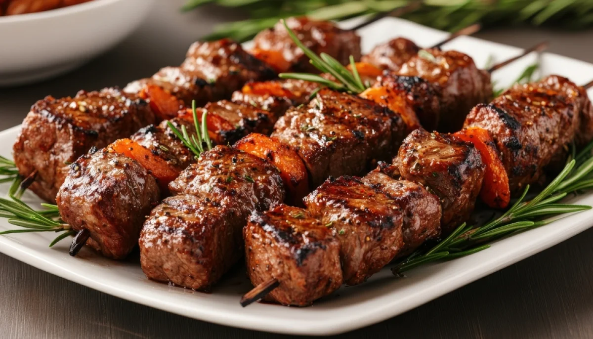 Savourez de délicieuses brochettes de bœuf grillées, tendres et parfumées aux herbes, idéales pour un repas convivial et gourmand.