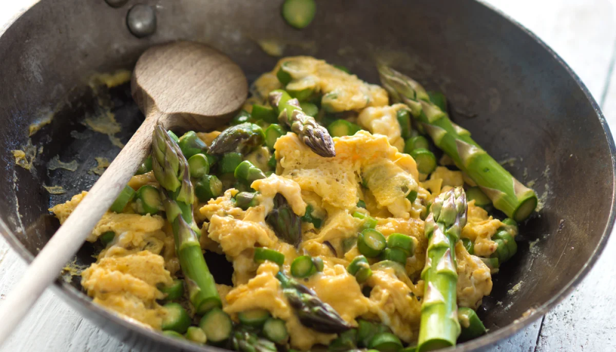 Savourez une brouillade d’œufs aux asperges vertes, une recette française facile et rapide idéale pour un brunch léger et gourmand.
