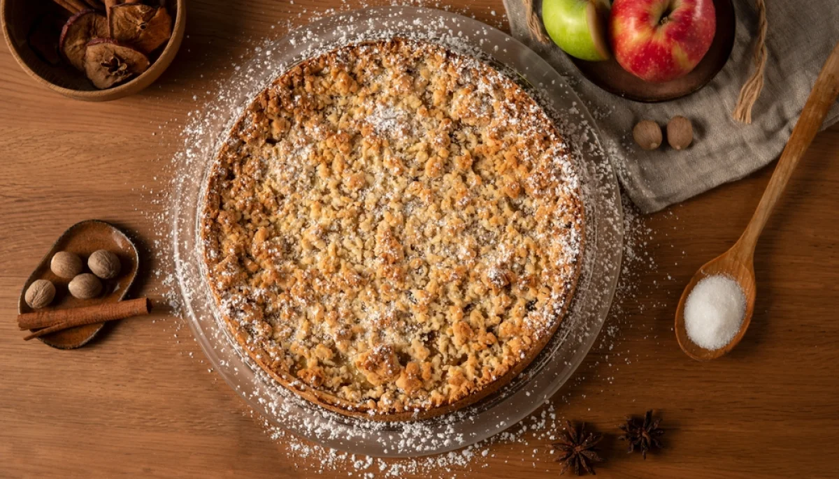 Savourez un crumble aux pommes doré et croustillant, relevé d’une touche de cannelle, un dessert gourmand et réconfortant à partager.