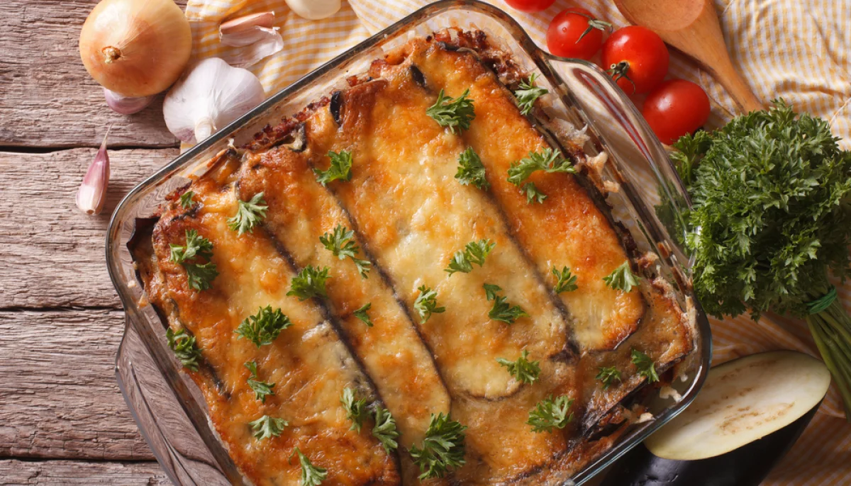 Savourez une moussaka traditionnelle fondante et généreuse, aux aubergines parfumées et à la viande mijotée, emblème de la cuisine grecque.