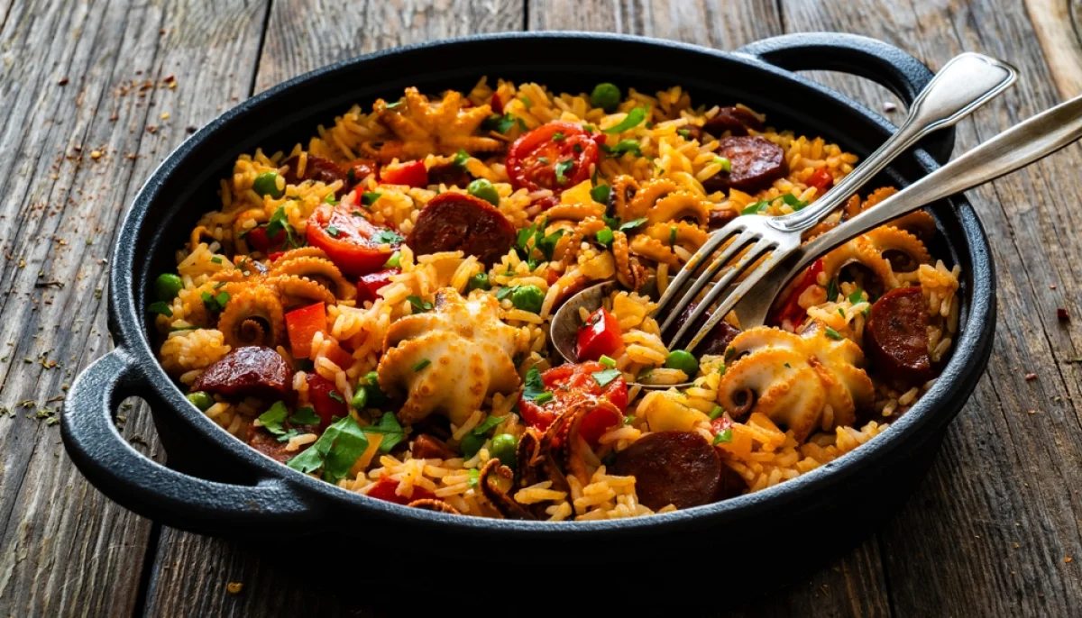 Savourez cette paëlla marine au chorizo, un plat espagnol coloré et parfumé alliant fruits de mer, riz et chorizo pour un repas convivial et chaleureux.