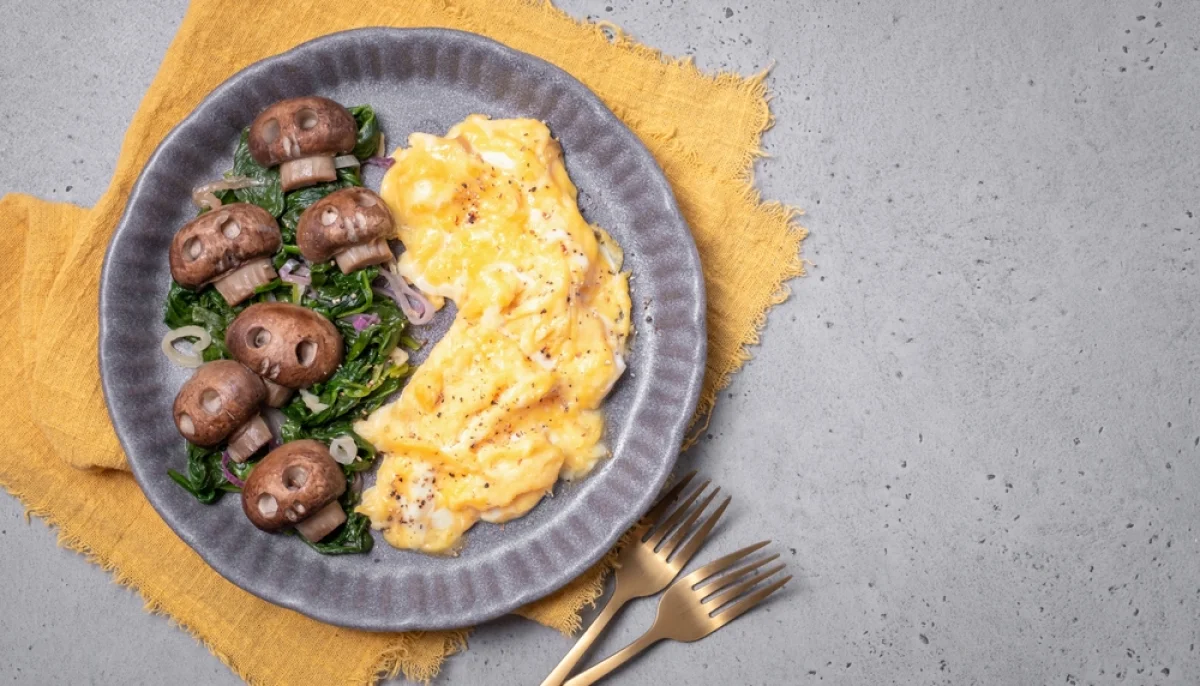 Savourez une poĂȘlĂ©e de champignons et des Ćufs brouillĂ©s onctueux pour un repas rapide et Ă©quilibrĂ©.