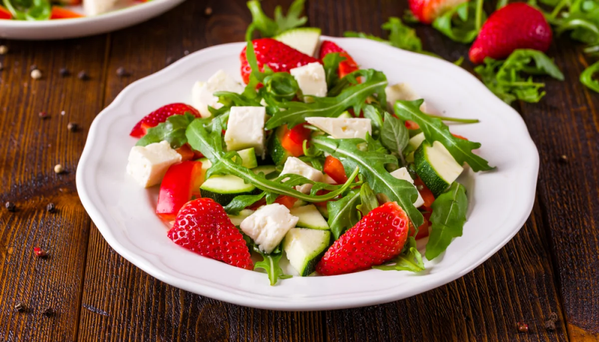 Savourez une salade fraîche aux fraises, roquette et feta, idéale pour un repas léger, coloré et plein de saveurs estivales.