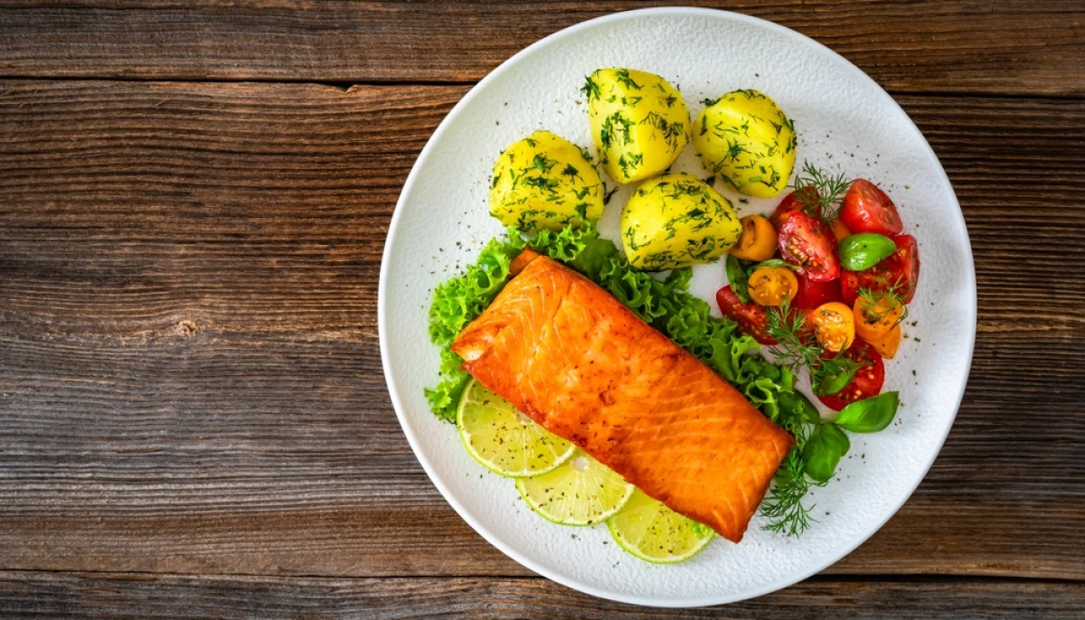 Savourez un saumon grillé avec pommes de terre et salade fraßche, une recette française facile et équilibrée idéale pour un repas sain et gourmand.