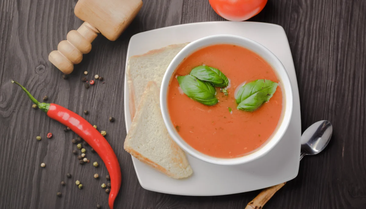 Savourez une soupe de tomates crémeuse et parfumée au basilic, idéale pour un repas léger et réconfortant.
