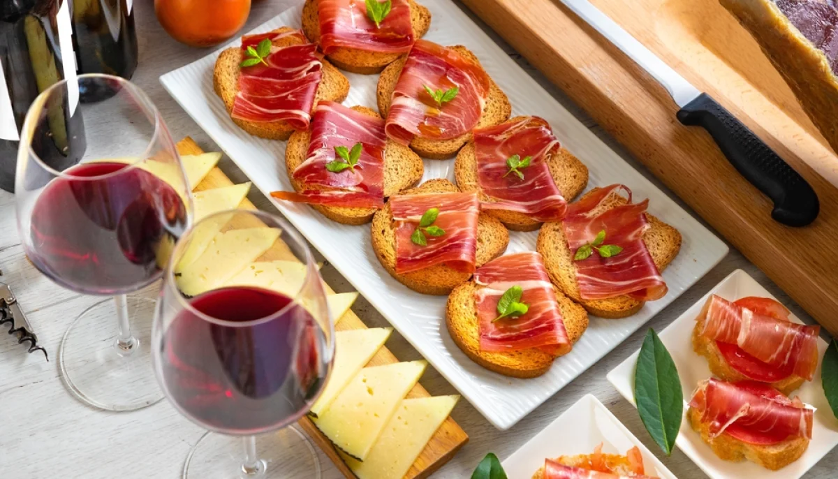 Savourez des tapas raffinées de jambon ibérique sur pain grillé, accompagnées de fromage manchego et d’un verre de vin rouge pour un apéritif élégant.
