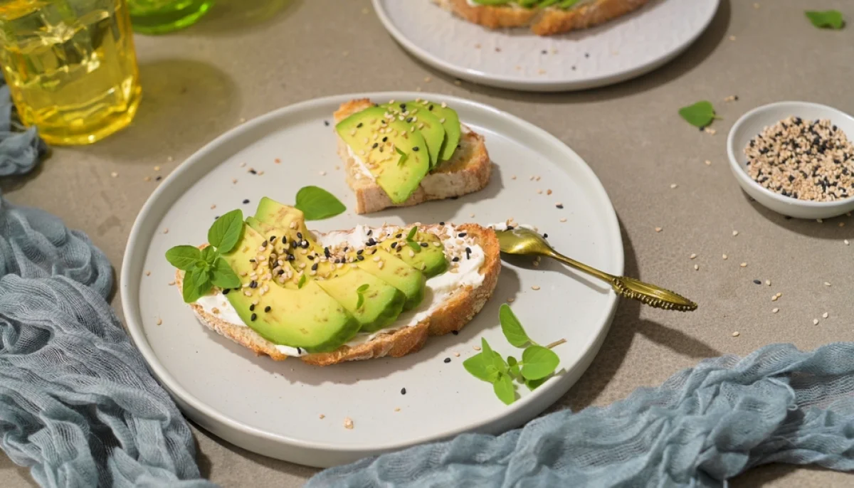 Savourez un toast croustillant à l’avocat et fromage frais, garni de sésame et herbes fraîches.